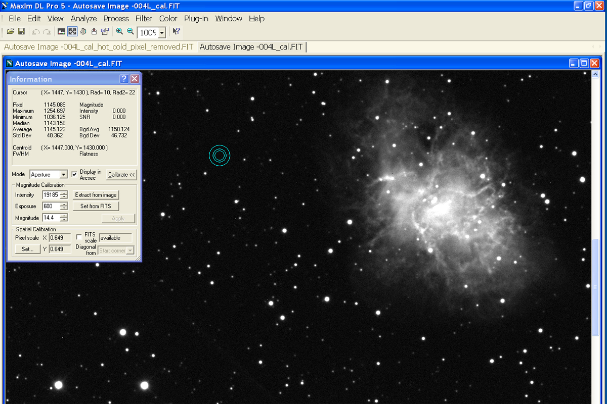 Shown is an image of M1 taken at my observatory on February 22, 2011 (top left).  It was constructed from 12 x 10 min luminance frames and a varying number of 10 min red, green and blue frames (click here for details).  To assess the quality of the sky, I measured the brightness of the background sky and sharpness of the stars using one of the 10 min luminance frames.  The first measurement (sky brightness) reflects the amount of local light pollution and determines the lower limit (faintness) of what you can image (and see).  The second measurement (star sharpness) reflects the steadiness of the air and determines the level of detail (resolution) that you can image (and see).  Steady, transparent air and dark skies are ideal for imaging and observing.  As shown in the top right image (M1 was 68 degrees above the western horizon and the moon had not risen yet), the background sky flux was 1,050 analog-to-digital units (ADU) after subtracting the 100 ADU pedestal that the program adds, which corresponds to 1.4 electrons (e) per second (s) (CCD camera gain = 0.79 e/ADU).  The sky brightness at the zenith on a moonless night is ~1.0 e/s or 20.5 magnitudes/square arc-sec [see here (large file) and below].  For comparison, the background sky flux is ~0.7 e/s at Kitt Peak, and ~0.3 e/s at New Mexico Skies.  The sharpness of the stars is determined by measuring their full-width-half-maximum (FWHM), which reflects how quickly the pixel intensity declines when moving away from the star's center.  In a perfect world, all of the starlight should fall on a single pixel since the source is very far away and, therefore, a point source of light.  In reality, however, the starlight is spread over several neighboring pixels due to turbulence in the earth's atmosphere, and less than perfect polar alignment of the mount, autoguiding, and focus.  The FWHM of a star just below the nebula is 1.85 arc-sec (bottom two images), which is excellent.  This result is even more impressive considering it was determined with a 10 min exposure.  Longer exposures typically result in "bloated" stars and a higher FWHM due to the factors mentioned above.  Obviously, the autoguiding was outstanding that night (click here).  Hence, the sky conditions at my observatory are pretty good.  The sky is relatively dark (about 4.5 on the Bortle scale), and the air is dry and stable once the heat leaves the Sonoran desert.  The only drawback is a light dome above the southeastern horizon (click here).