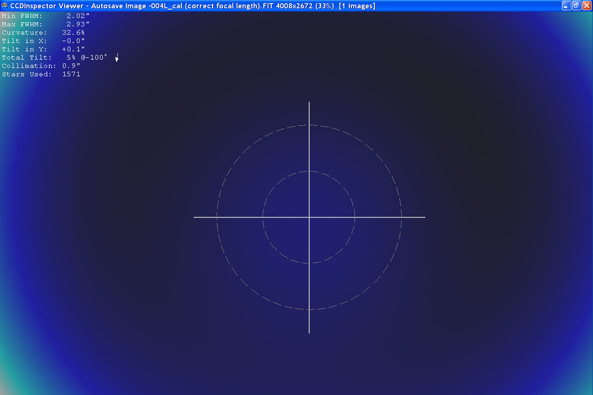 Using the same luminance frame of M1 (see above), I assessed the telescope's collimation and field curvature with CCD Inspector v2.  Collimation reflects how well the telescope's optical and physical axes are aligned.  The better the collimation, the sharper the image.  Field curvature reflects the sharpness (FWHM) of stars over the field of view (FOV).  Most telescopes have field curvature because the focal plane of the optical system is curved, which presents a problem when the detector (i.e., CCD chip) is flat.  A small field curvature (or flatter field) results in more stars being in focus over the FOV and, hence, better images.  A large field curvature typically results in stars in the middle being in focus while those near the corners being out of focus.  The telescope was only 0.9 arc-sec out of perfect collimation (left), which is outstanding.  The field curvature was 33% (right), which is significant (and undesirable) and characteristic of the Ritchey-Chretien design.  The colors represent the different levels of focus with black being the best, followed by blue, green, red.  Inspection of the M1 image (above, top left) shows that the stars at the corners are elongated (a phenomenon called astigmatism), which is characteristic of the Ritchey-Chretien design.