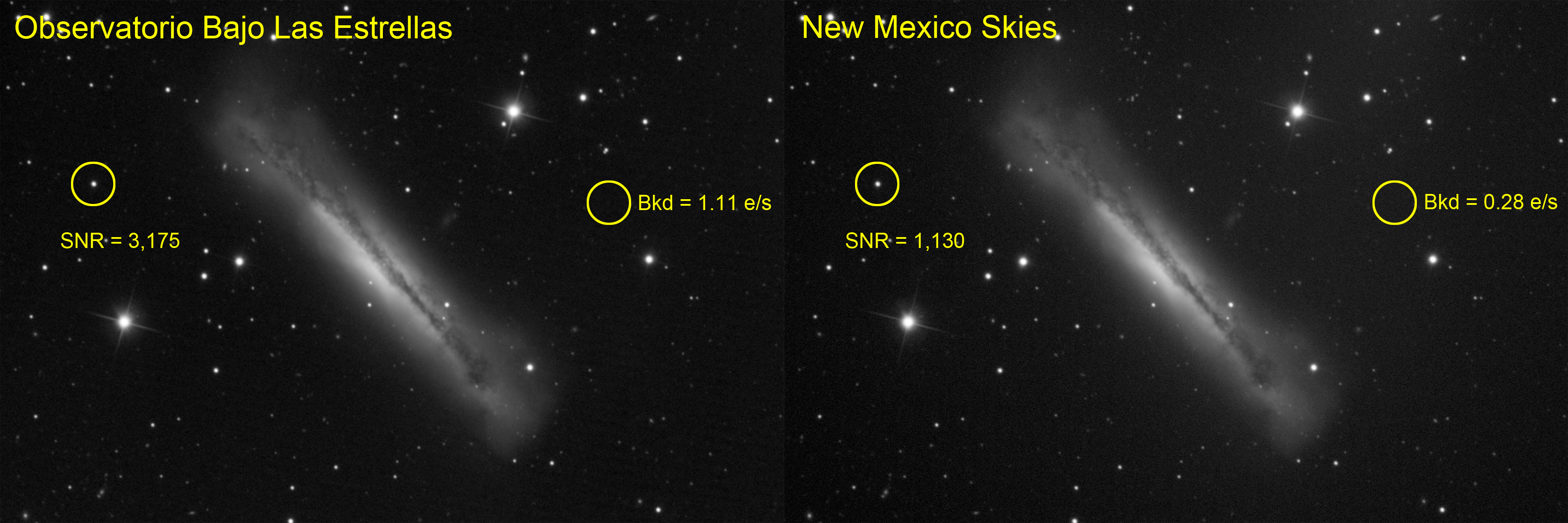 Shown are master luminance frames of NGC 3628 taken at my observatory (left) and New Mexico Skies (right) with my 12.5" Ritchey-Chretien.  New Mexico Skies is an observatory in Mayhill, New Mexico that has some of the darkest/clearest skies in the United States.  The image on the left is a mean combine of 12 x 10 min frames.  The image on the right is a mean combine of 2 x 15 min frames.  The signal-to-noise ratio (SNR) is better in the left image (3,175 vs 1,130), albeit it was generated from a greater number of individual frames (but less time per frame) thereby improving the SNR 2-fold relative to the right image.  Close inspection of the image on the right shows significant noise, probably because the exposure time was too short given the dark skies and too few frames were taken (see "Determination of Subexposure Time" below).  As expected, the sky brightness (Bkd) at my observatory is 3- to 4-fold greater than at New Mexico skies (see here).  Nevertheless, the skies at my observatory are pretty good and I can acquire images with nearly the same quality as those taken at one of the darkest/clearest sites in the US.