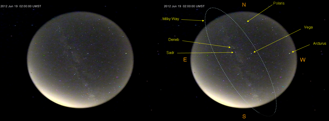 Shown is an image of a moonless night sky over Observatorio Bajo Las Estrellas on June 19, 2012 at 2:00 AM.  The image was taken with a Moonglow Technologies All Sky Cam.  The light dome in the southeast is Tucson.  The faint light dome in the northwest is probably Phoenix.  The Milky Way is visible despite these light domes.  The sky brightness at the zenith on a moonless night is 20.5 magnitudes/square arc-sec (see below).
